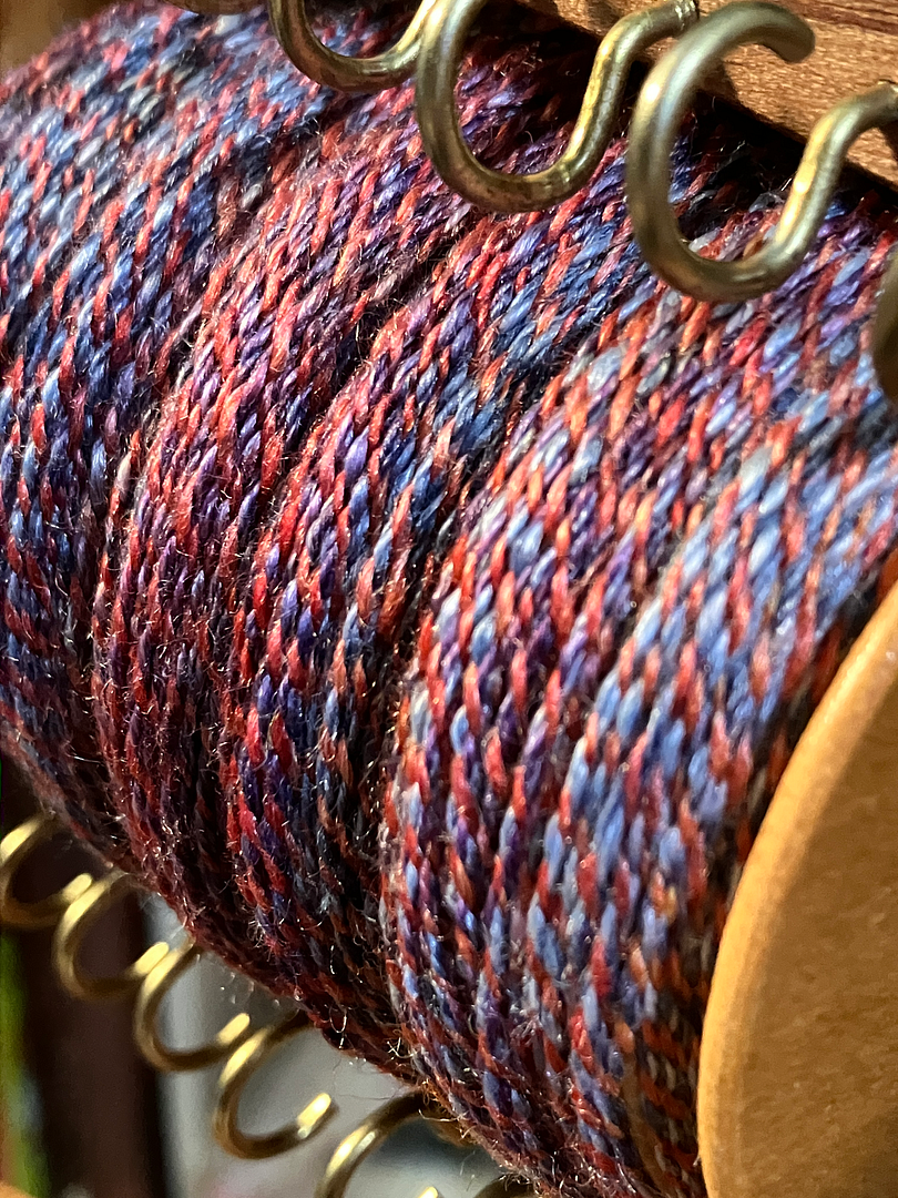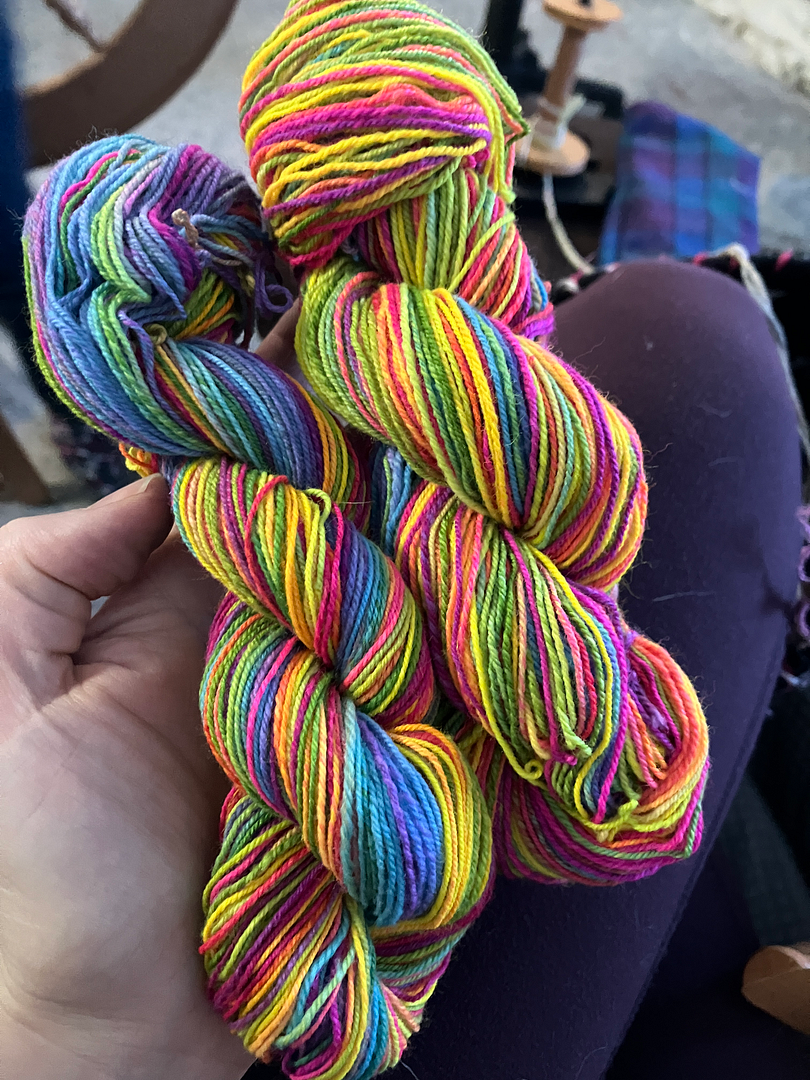 This month I finished a little sock spin that was a bit of an impulse. Dooner saw me spinning some samples for spring episodes of the Wool Circle, and had to have something with this highlighter-coloured fiber. So I spun the remaining 2.5 oz into a chain-plied sock yarn for her. I’m not sure yet what it will become.