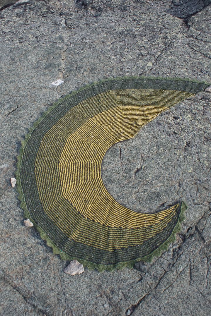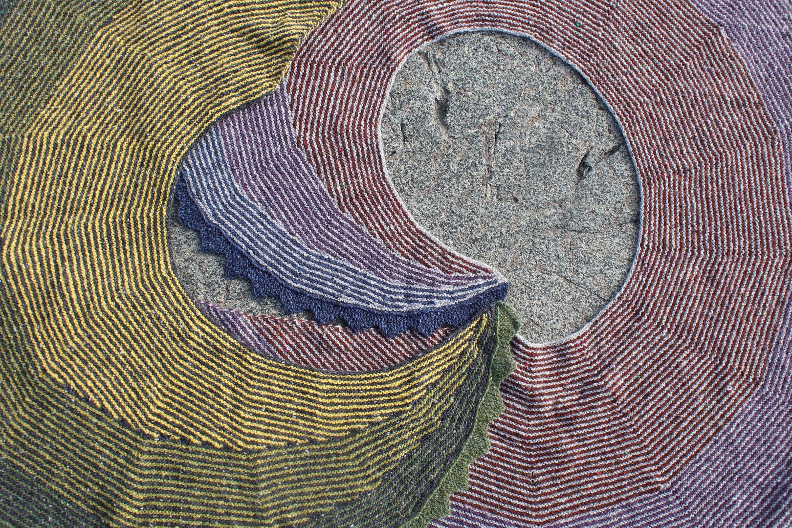 All that to say, while it was more complicated to write than I intended, it is very simple to knit. It’s lots and lots of garter stitch; if you’re well enough to knit at all, you can knit this. Markers for increases are placed as you cast on (also helping you count stitches), then pretty much all you have to do is increase at the same points every right-side contrast-colour row, and turn your work at easy-to-find points. A few extra short rows are added at the end of each colour section, and an easy garter-lace border polishes it off. It’s a lot of knitting, but it’s made to be achievable while not feeling great.