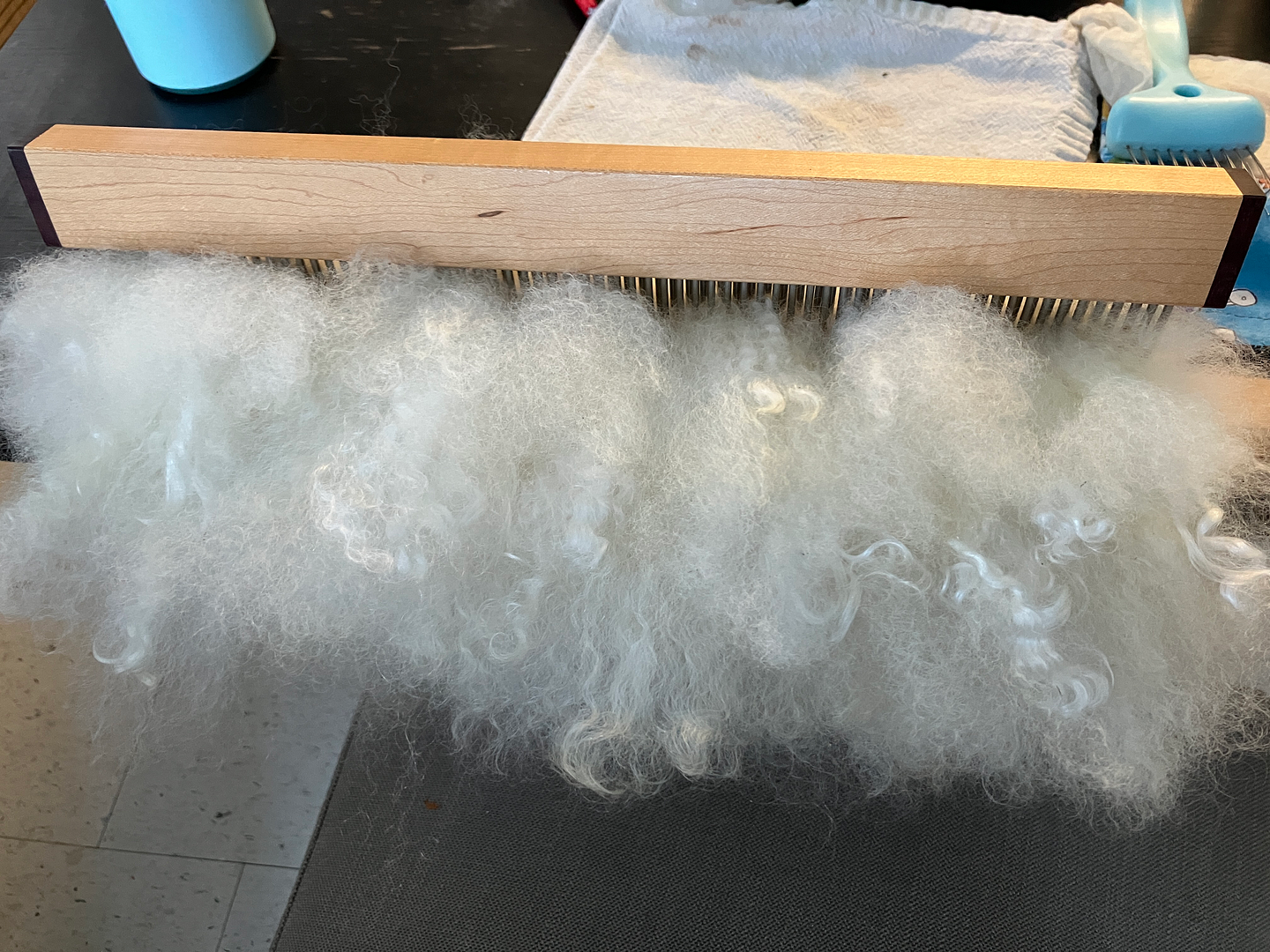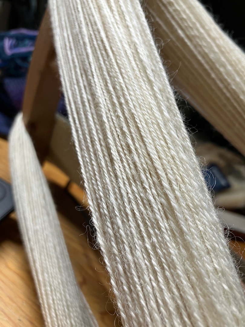 And I hackled together my own Breed Blend and Colour study from fleece I happened to have lying around. This made a quite different spinning experience, and a smooth three-ply yarn.
