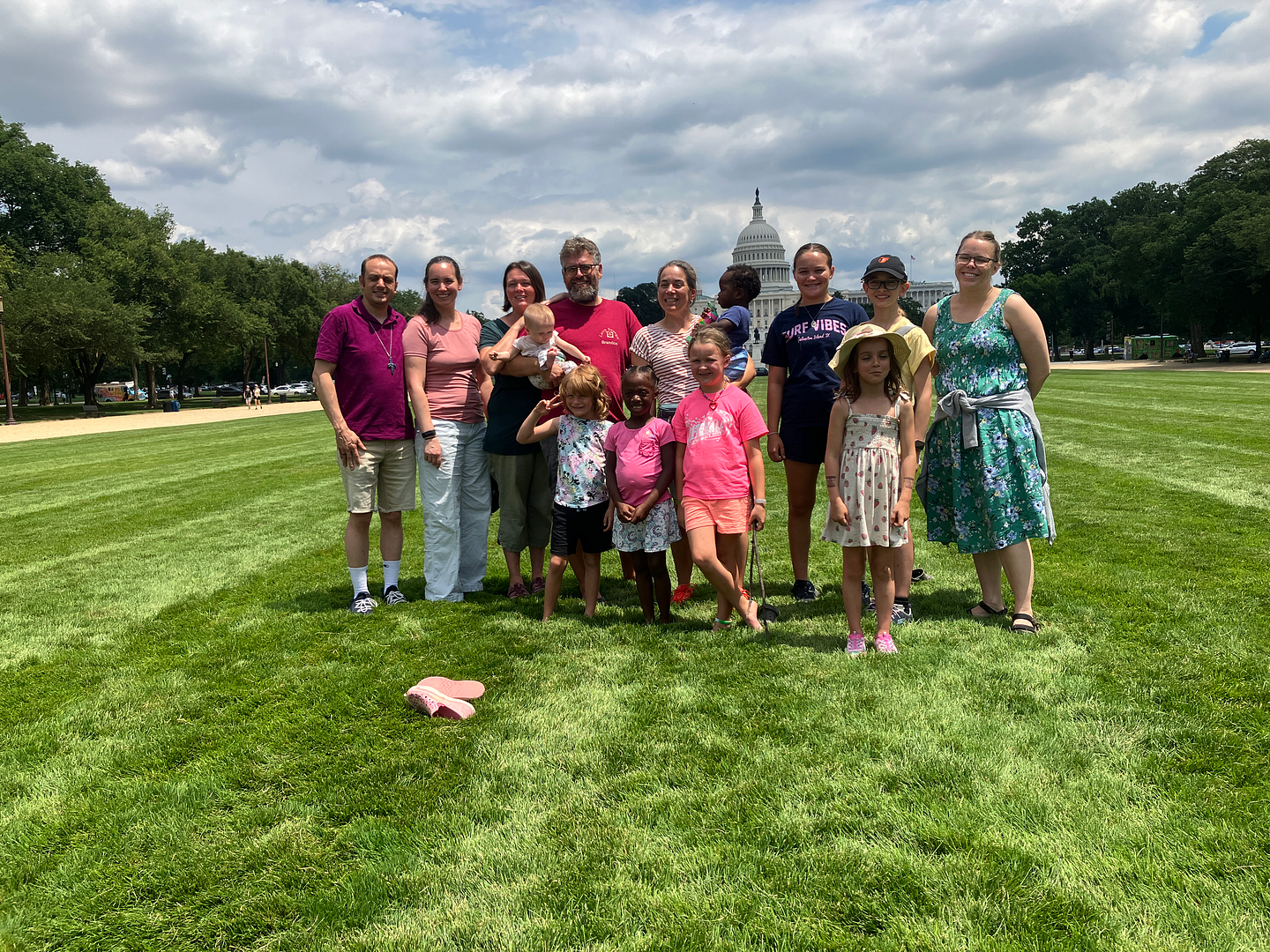 We spent a day in DC, meet up with my college friends and their ample families, and going to museums. Here we are, with what kids we could get to stand in the picture, on the National Mall. That’s the capitol building in the background.