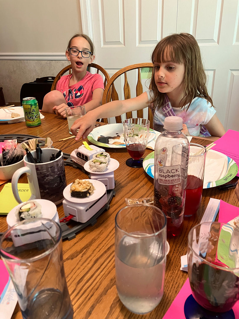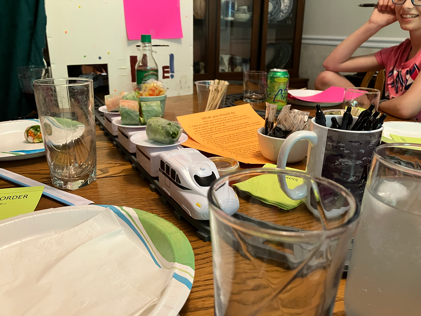 Minimighty and Papa Bear make the “Sushi Train.” The words “sushi train” seem to have been put together especially to serve my family’s interests. My dad had planned to just put sushi on a train, but MiniMighty came up with an elaborate plan involving a menu, placing orders, etc… it was quite the production. It was adorable and so much fun.