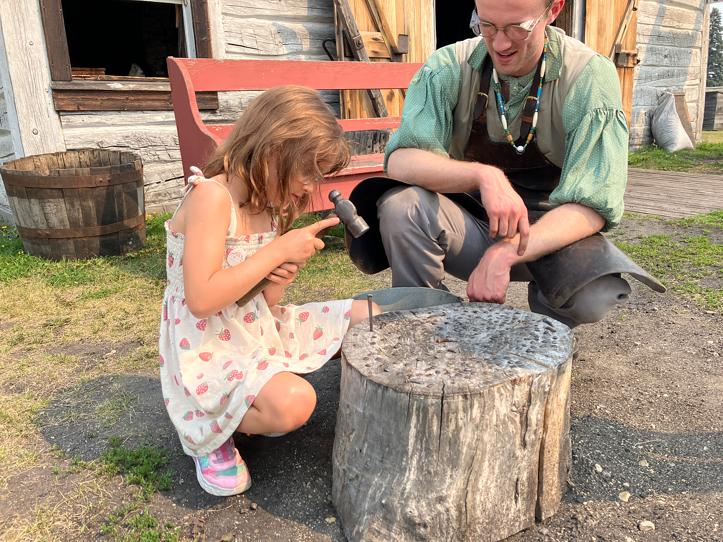 Driving in nails that were handmade in the working blacksmith shop behind them.