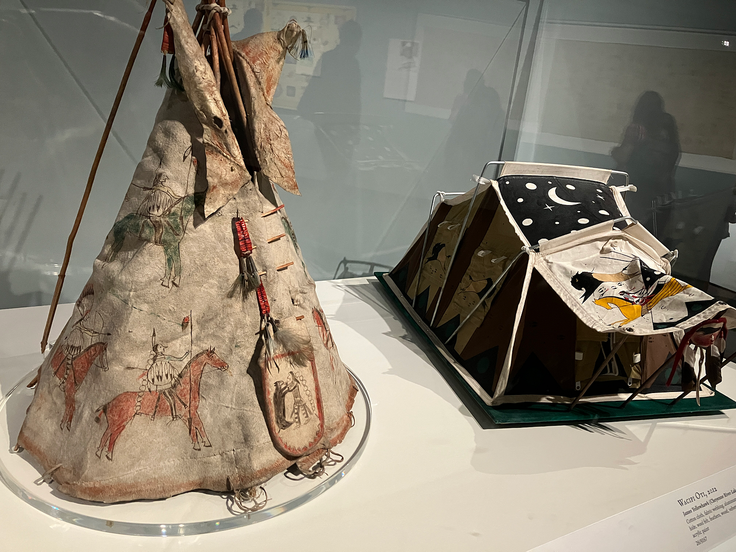 A beautiful antique painted toy teepee, and a modern Coleman model tent painted in a similar style. This exhibit was all about how plains Indians tell stories on textiles.