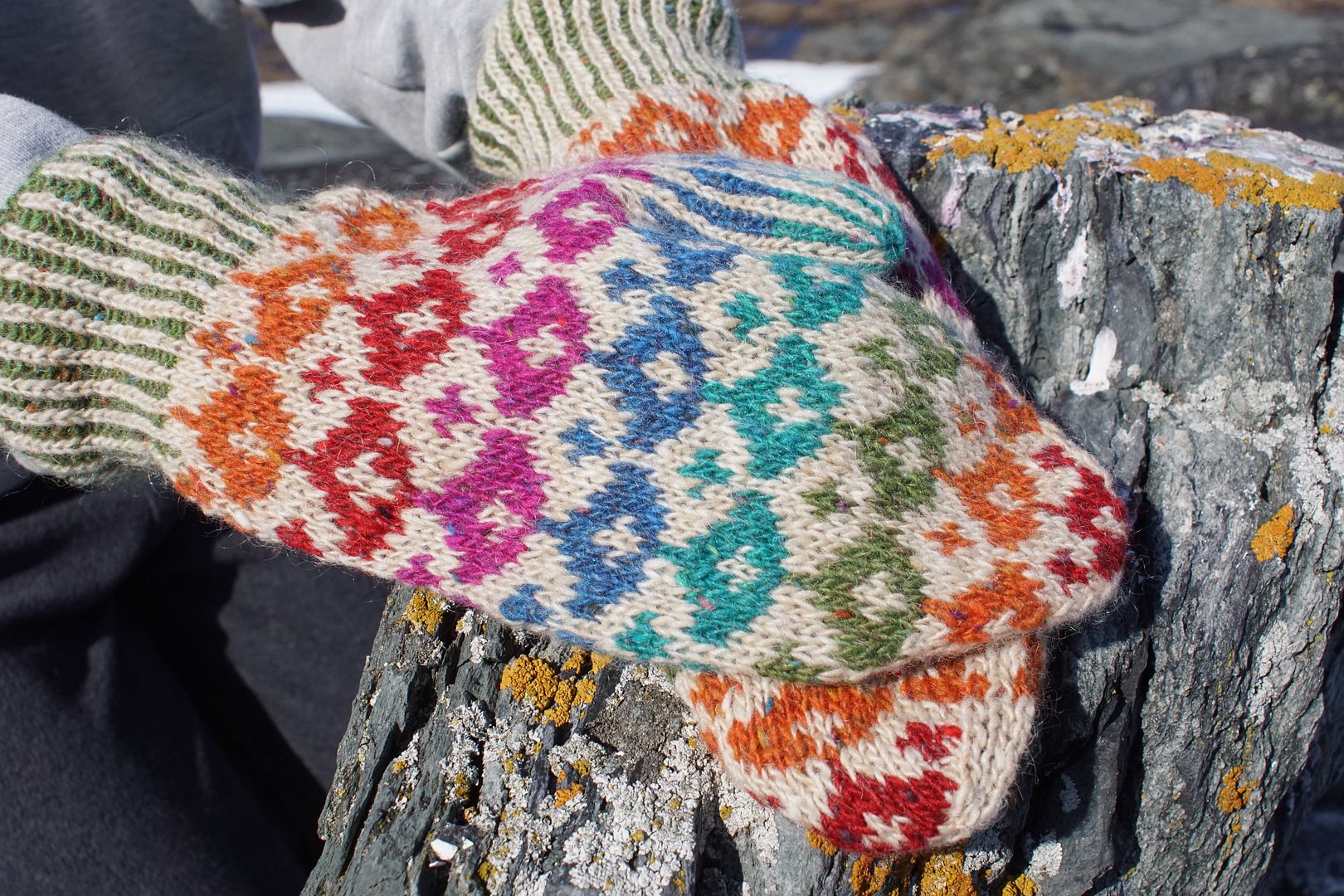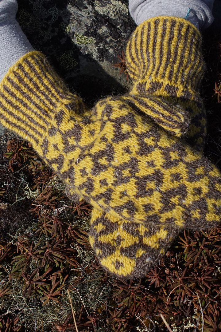 These mittens feature deep cuffs in corrugated ribbing, changing needle size halfway up for a bit of flare. Like all fair isle mittens, I suggest you knit these inside out to keep your floats loose. If you knit fair isle with both hands, you can swap hands every four rows to keep the patterning exceptionally even. You’re working the widest part of each clamshell for four rows – keep that colour in your left hand, crossing under, so it pops more. (Just make sure that you knit the vertical lines of the thumb gusset with the same hands every time, or the lines will wiggle.)