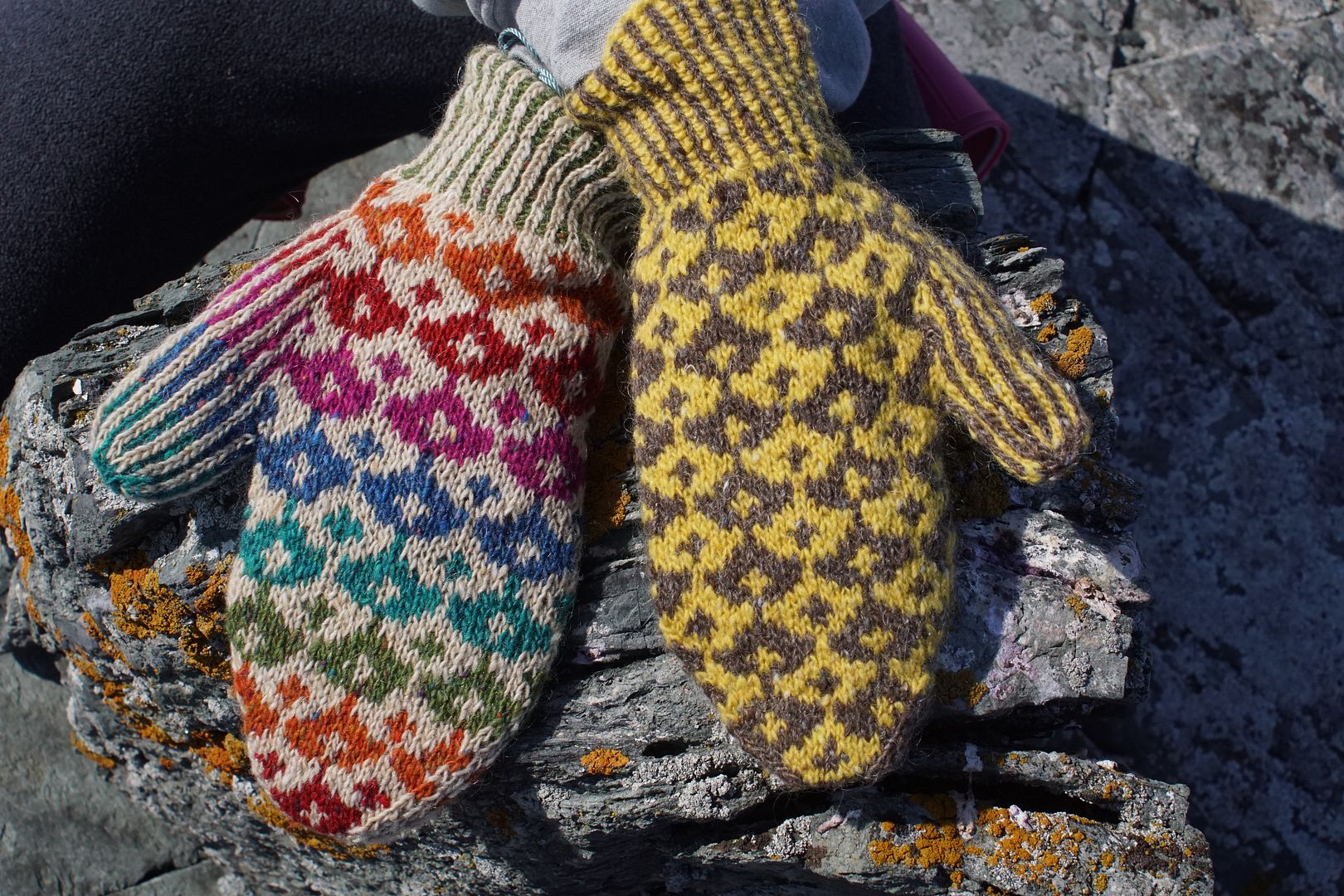 The above mittens are knit with Cowslip and Hare of Milarrochy tweed, for the “Butter on Rye” colourway. If you want some more colour in your life, though, grab some jewel shades for the “Allfruit” colourway, below.