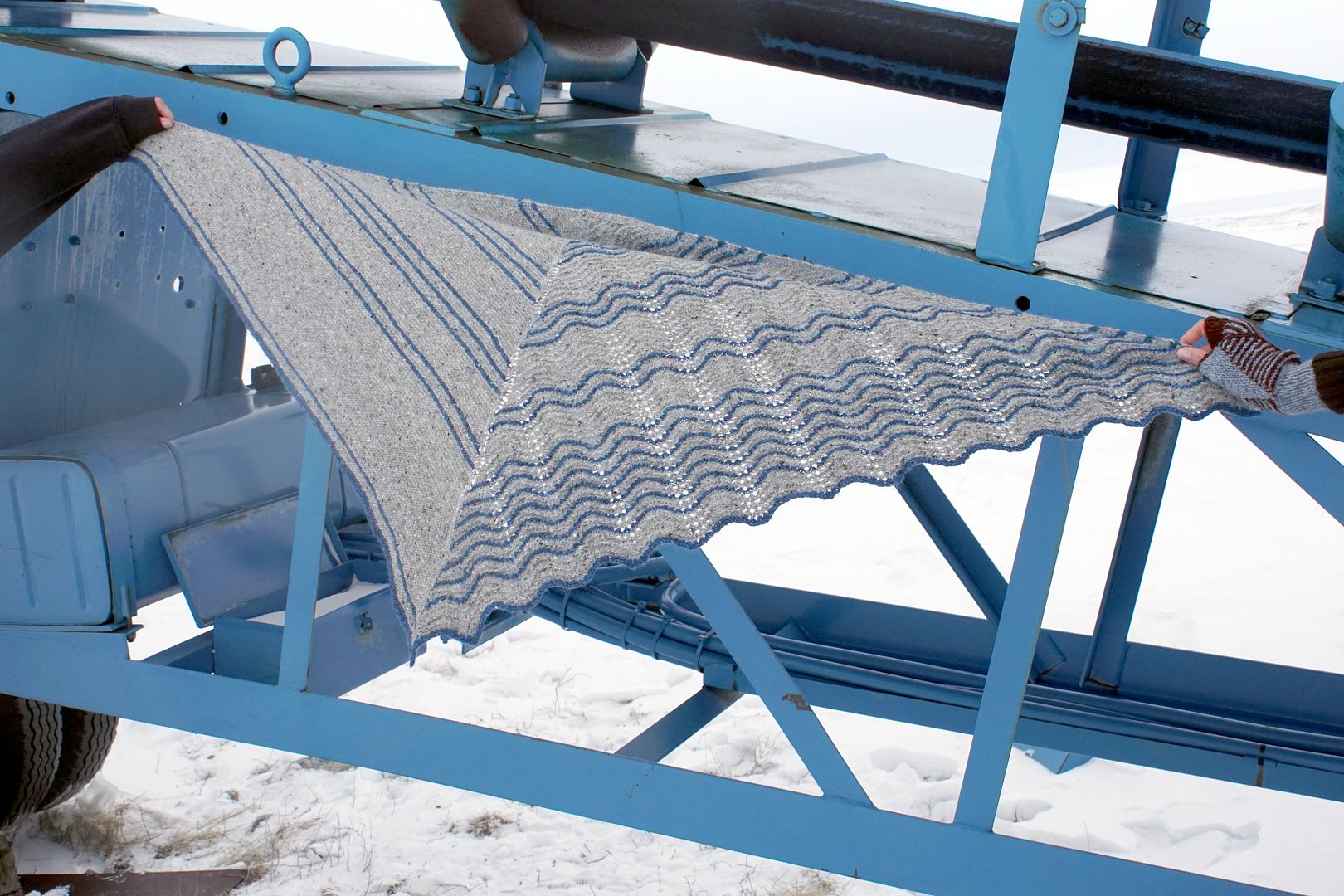 Just how assymetrical your shawl is may depend on your knitting style. The sample I knit (grey and blue) I easily blocked so that the Old Shale and garter halves are the same size, and the center line falls straight down. My test knitter, however, ended up with a more relaxed garter stitch section, giving the center line a bit of a slant, like some very popular shawl patterns in circulation these days. I encourage you to embrace what your gauge makes, and don’t be afraid to block severely.