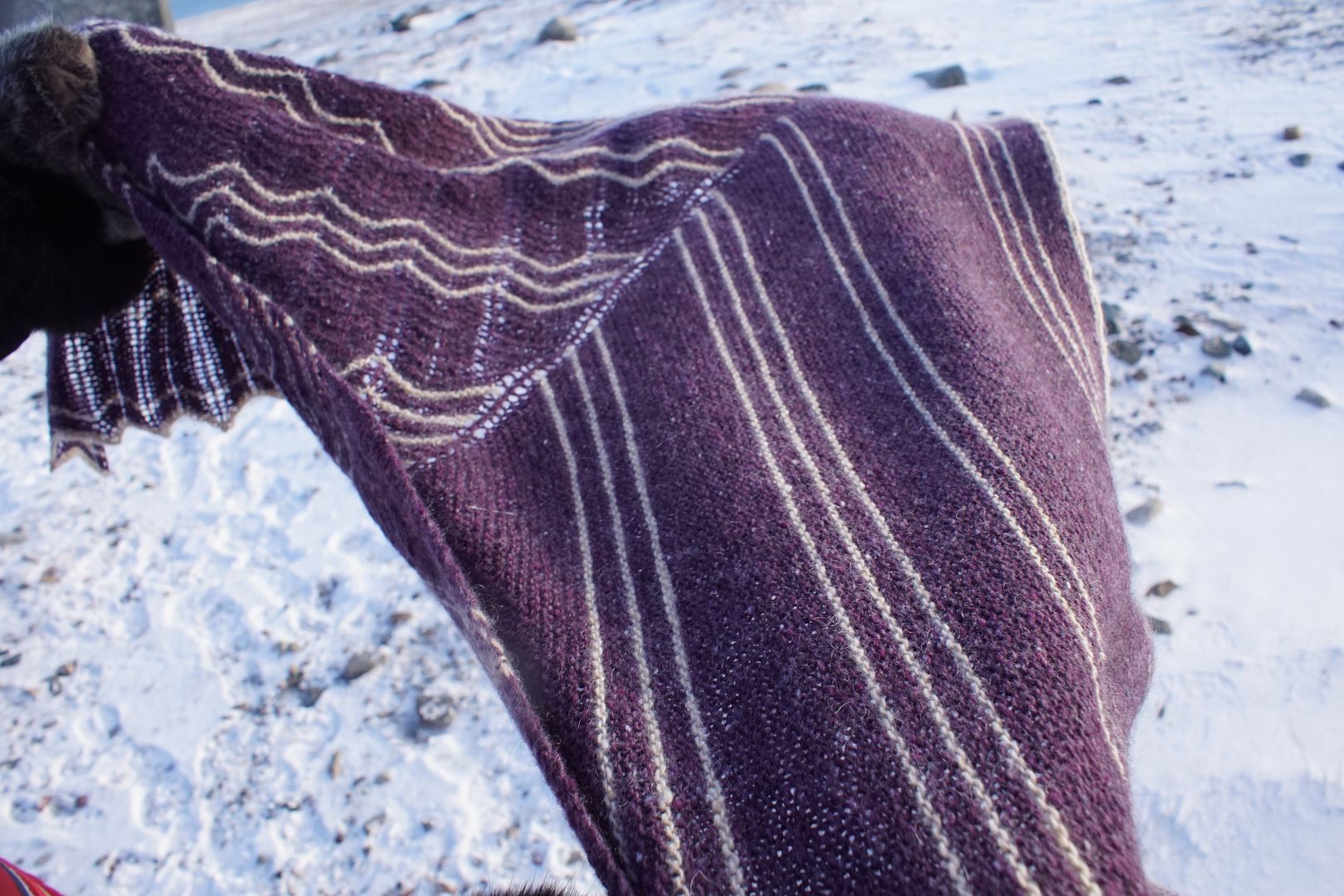 I’ve offered this shawl in two suggested colourways, inspired by views of the sea: Morning (above), with grey Birkin and royal blue Tarbet; and Evening (below) with purple Gloamin’ and natural white Hirst. This is also a perfect pattern for highlighting a handspun colourway with a neutral background, or making your own colour combination associated with your own experiences.