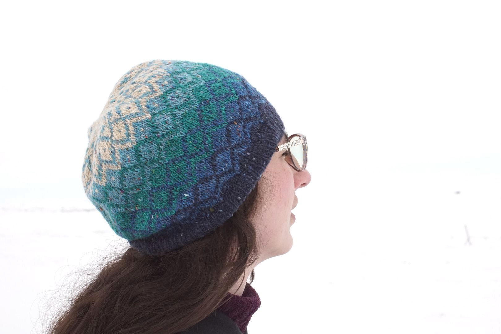 I chose to go from dark at the brim to light at the top of this hat, resulting in a sort of stylized circumpolar map, icebergs floating down and sinking in every direction.