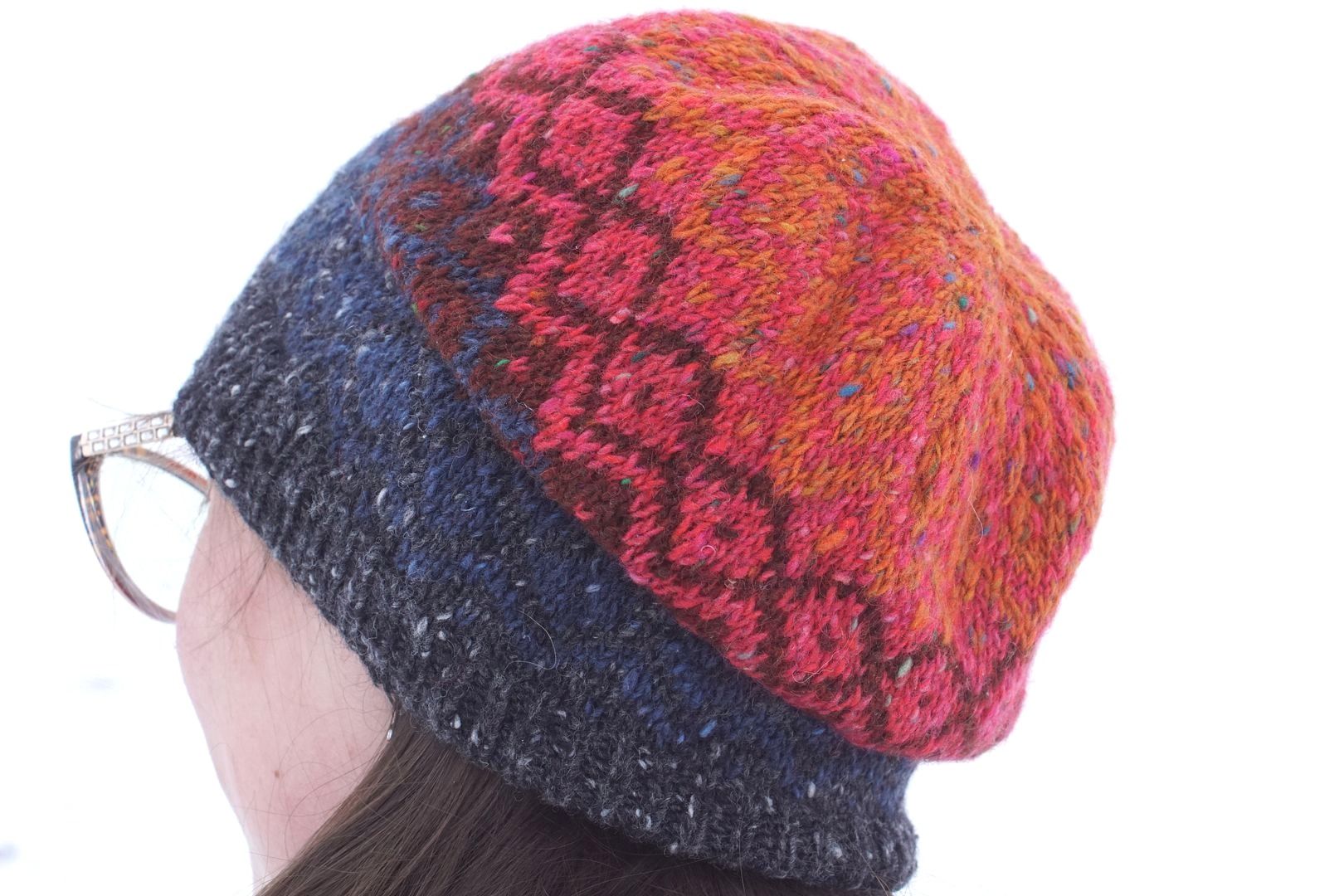 For the alternative colourway, I was inspired by a different kind of emotional fragility – holding back from anger. Stress can also make me more likely to explode! Managing to take a deep breath and control my tone – or more often, apologizing for losing my temper – is another kind of fragility. From that, I developed the Volcanic colourway you see below. While still traveling from dark at the brim to light at the crown, here the metaphor goes from solid to liquid.