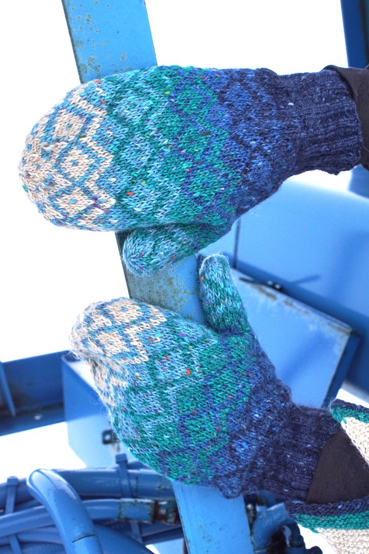 As with other fair isle mittens in this set, I do strongly recommend you try knitting these inside out! I find it takes away all my worries about tight floats in a small circumference. With both hats and mitts, try swapping hands so that whichever colour is part of the diamond you are knitting at the time is in your left hand. It helps the tesselating diamonds to all pop evenly.