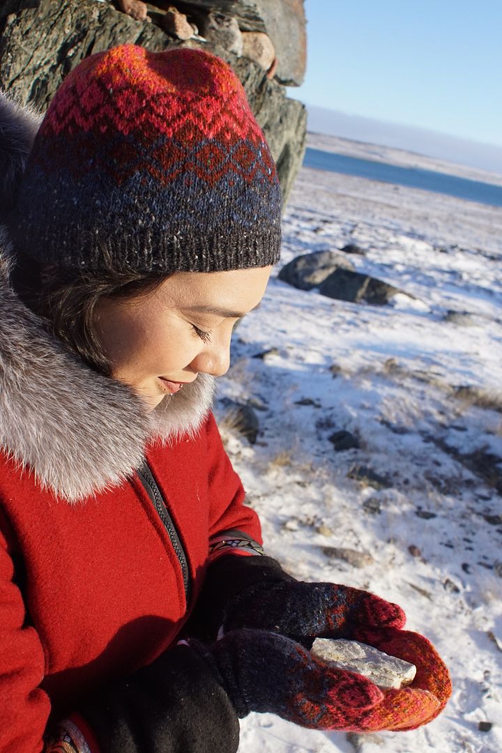 Thank you to Kelly Quinn for knitting both hat and mittens in the Volcanic colourway, and to Rebekka, Marikah, and Akumalik Sanguin for modeling.