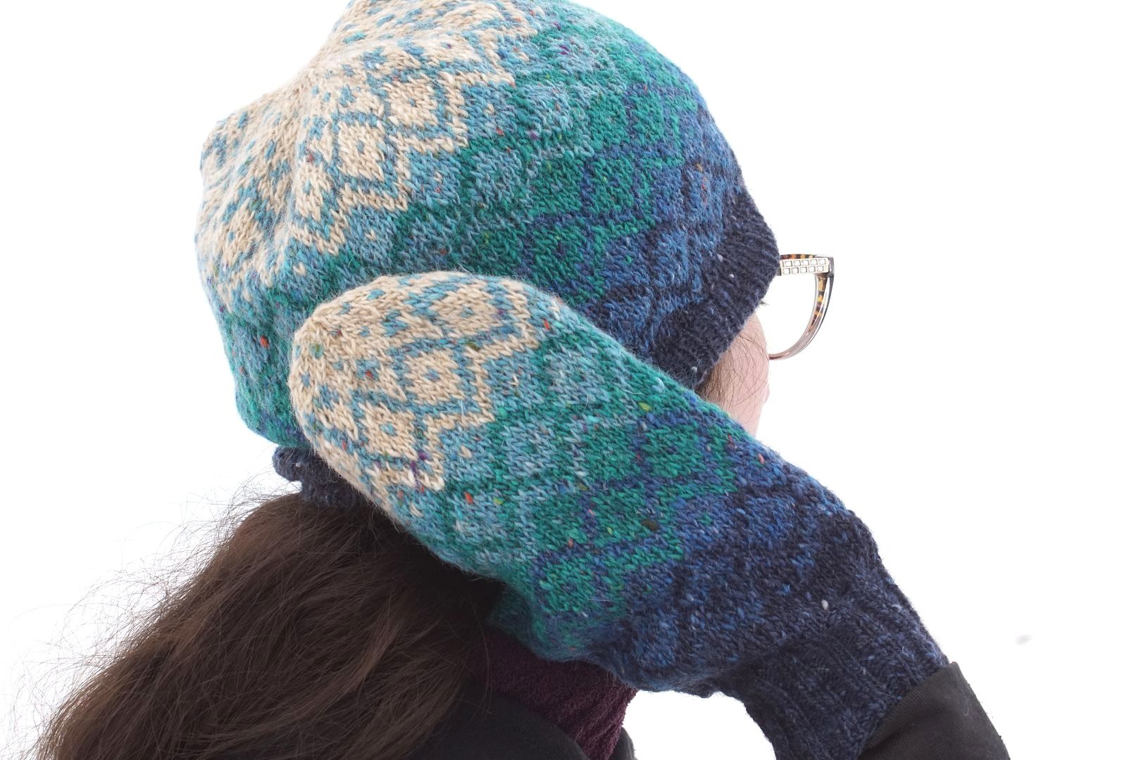 Conveniently, the height of a hat is not too different from the height of a mitten, so fitting the same gradient pattern on both makes a perfectly matched set. With the same simple fair isle pattern all the way around the mitten, both hands are worked the same; you don’t have to worry about rights and lefts.