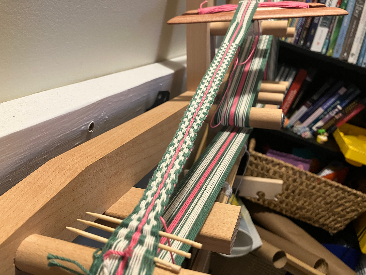 Very recently – like since Christmas – I finally started using my inkle loom. I’ve had this for a while, promising myself that I could use it when the book was finished. My mom made this actually possible by gifting me some weaving yarn and shuttles for Christmas (thanks mom)! Weaving, especially inkle weaving, is very much a side-hobby for me, but one that feels very playful and low-pressure, precisely because of my lack of ambition in it. Low-stakes creativity.