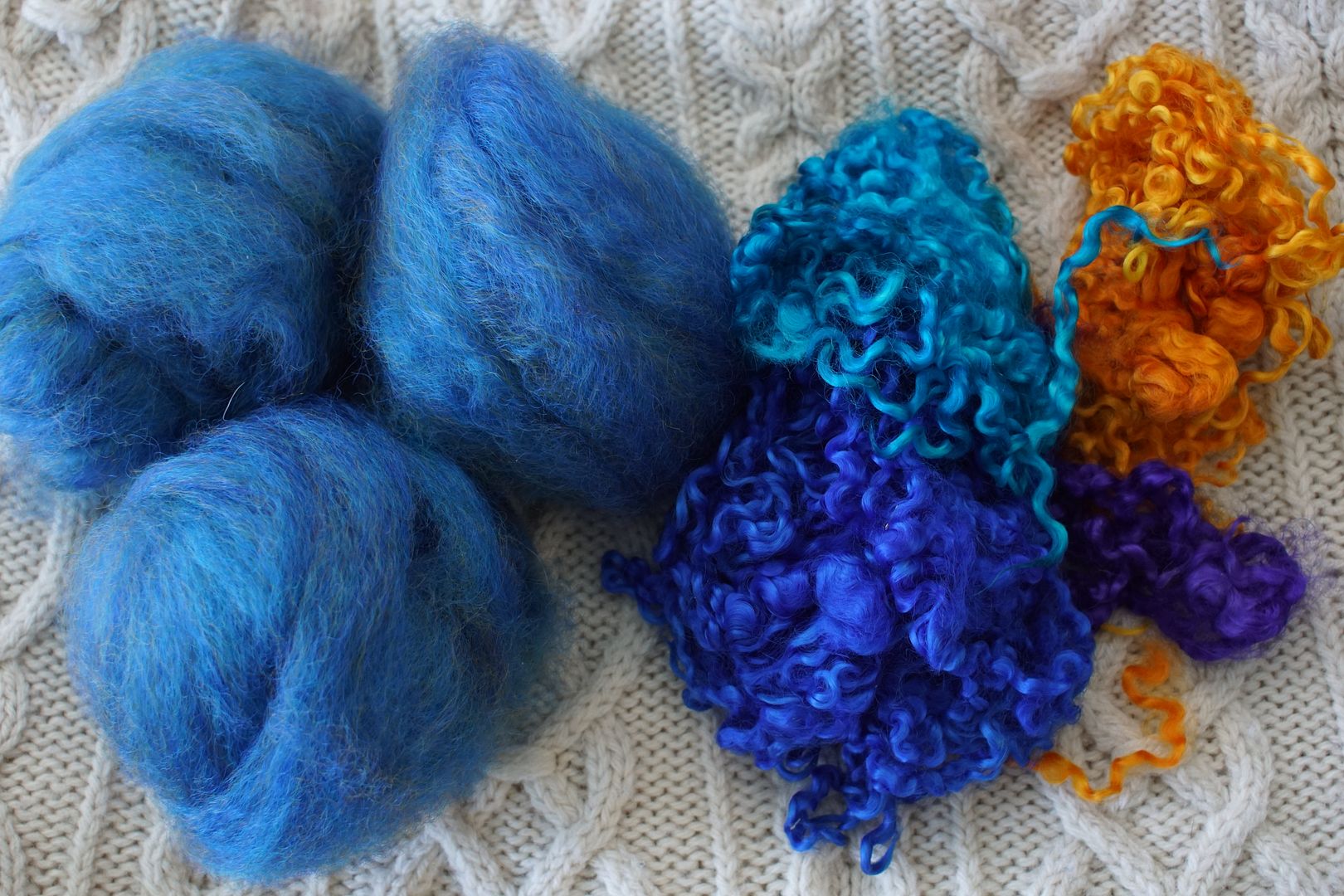 Wensleydale dyed by me, locks on the right, hand-pulled top on the left. This made the yarn you see above.