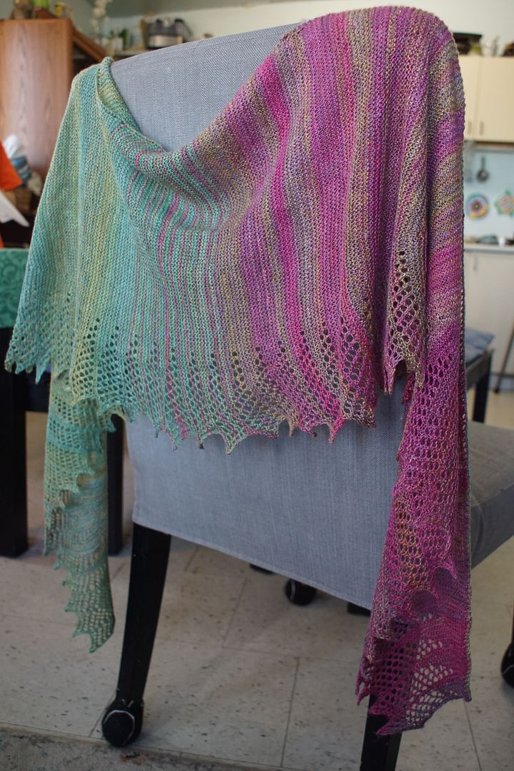 A long-time wish had been to make the “Hap for Harriet” pattern by Kate Davies out of this handspun lace I made in 2024. Dyed by Greenwood Fiberworks, spun into about 800 yards from one braid. I tore it apart to make it into two colourways that I blended together in the middle. I made it chiefly over my trip to Vancouver this fall.