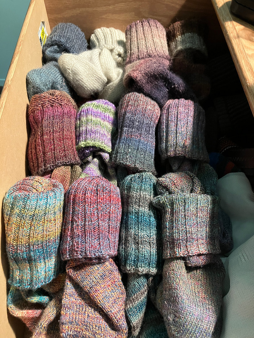 I knit all of these socks in the middle six months of the year. Here they are in rotation – I am endeavoring to wear them all the same number of times to test the durability of all these different yarn structures. I’ve done this before. I made these with my own adaptation of a new-to-me toe-up sock pattern by Kate Atherley that fits my foot like a dream.