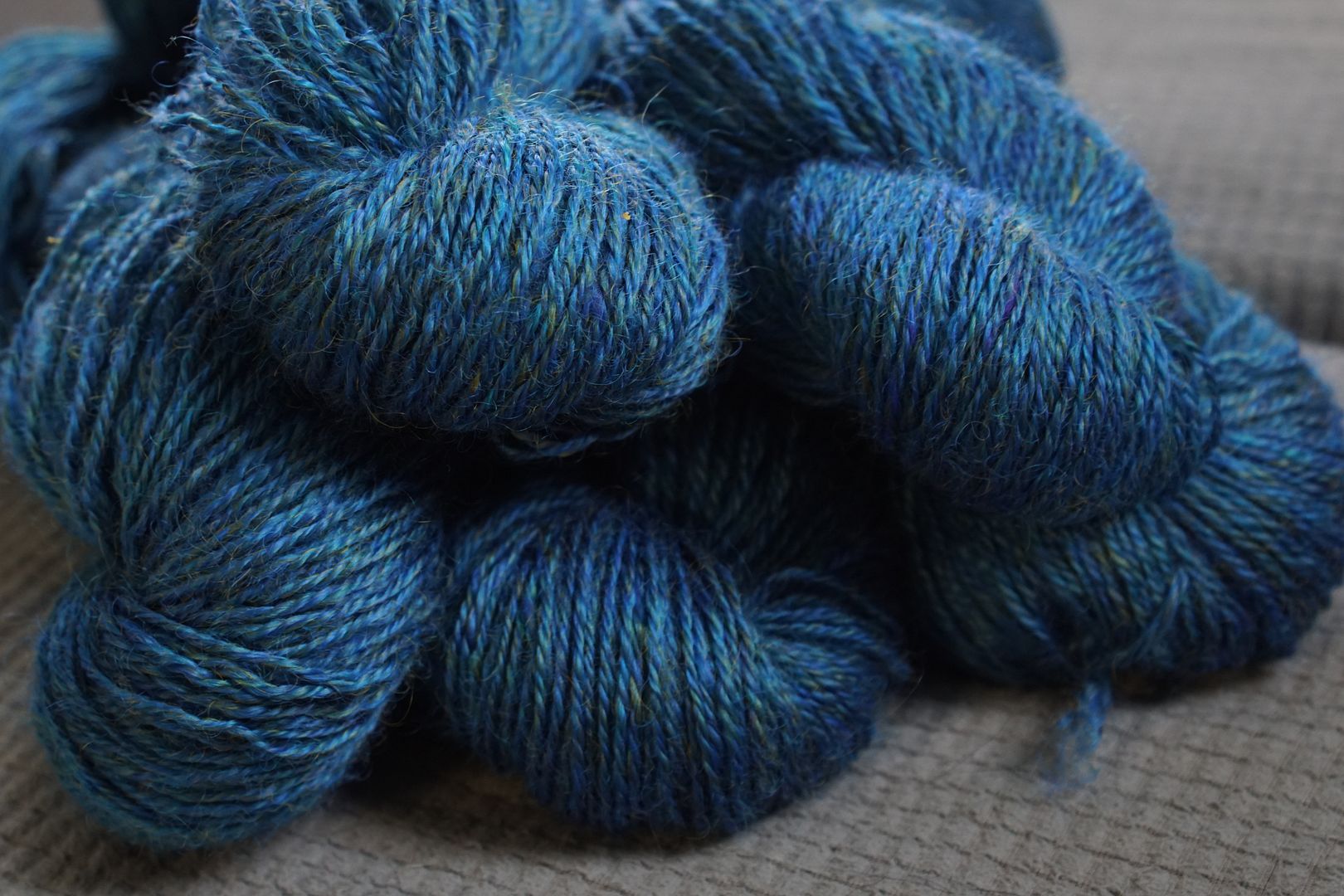I did manage to squeeze in one big sweater spin: hackle-blending and combing half of a Wensleydale fleece that I dyed, and spinning the hand-pulled top to make this gorgeous three-ply.