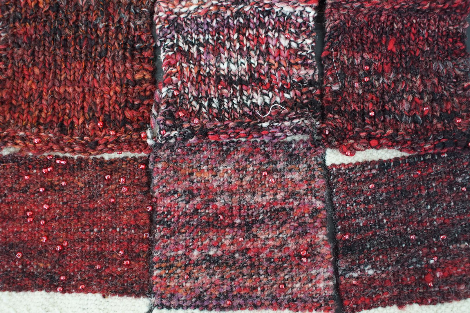 A few of the many swatches of yarns spun for demos. These are all spiral-plied yarns with beads. Wool blended by me on a blending board.
