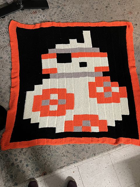 Finally, this isn’t small at all, but I knit this blanket for MiniMighty. She wanted to make it herself, and I preserved the few dozen rows she did at the bottom left of the blanket. Really she just wanted to have it. She inexplicably loves BB8 despite not having any other interest in Star Wars. This pattern is from the Knitting the Galaxy Star Wars knitting book ed. Tanis Gray.