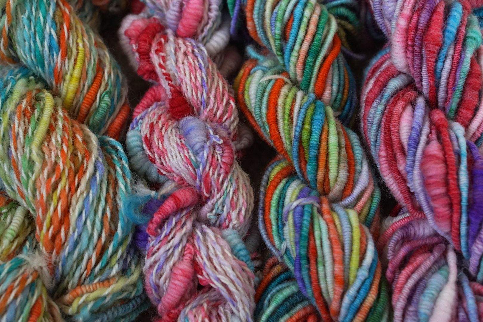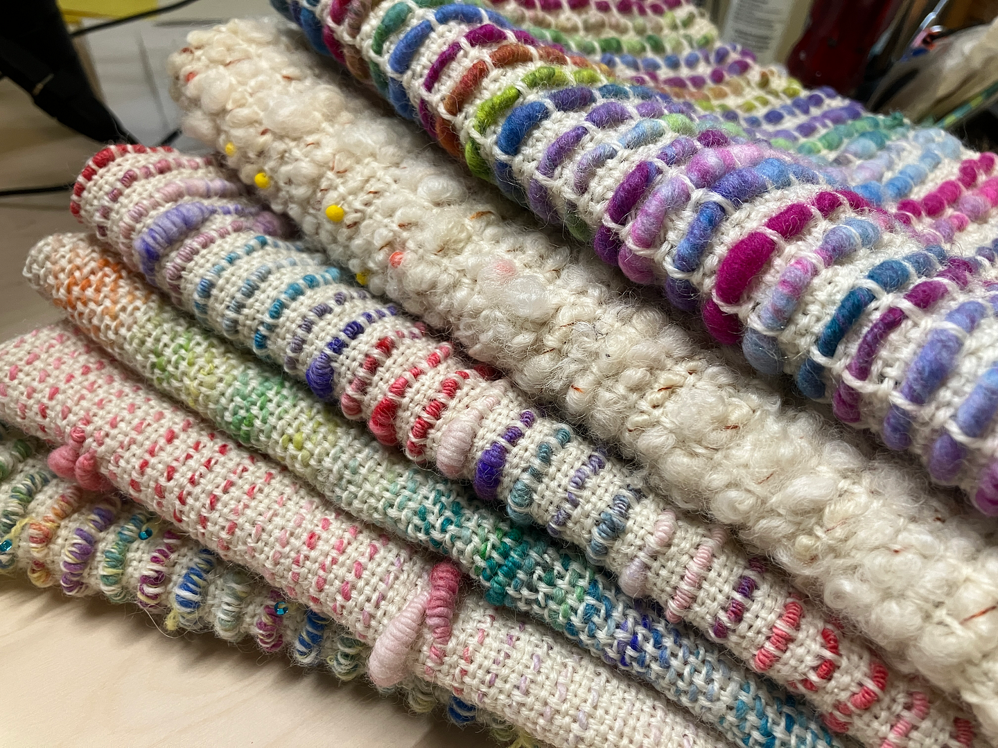 I got really obsessed with boucle in the fall. Swaledale dyed by Crafty Jaks; grey is a Gotland/Romney mix I processed from raw fleece; brights were a braid dyed by Bohemian Yarns.