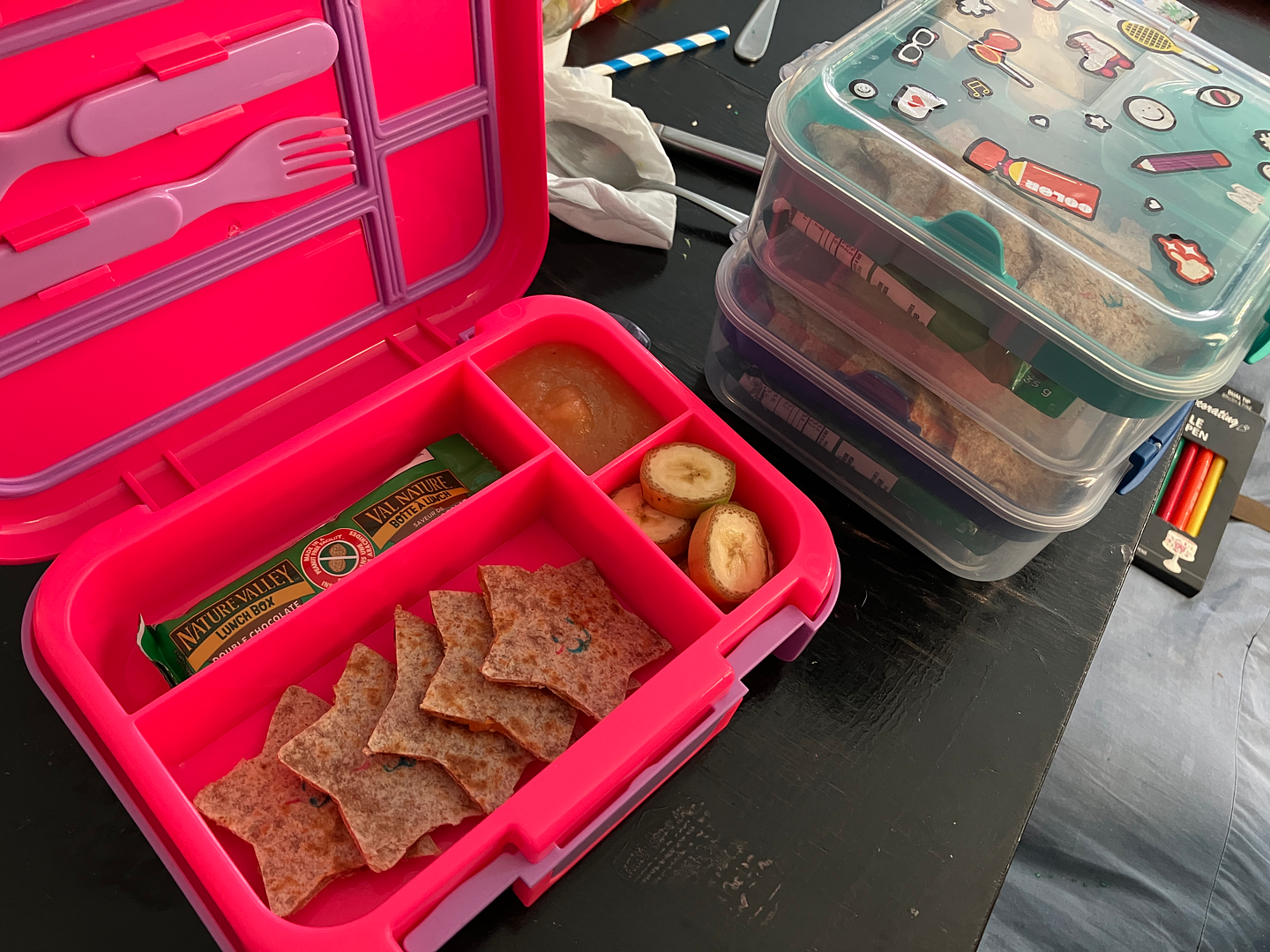 Wednesday: Cinnamoroll! Sanrio napkins not pictured. Quesadilla stars with faces, banana, apple sauce, and granola bar.