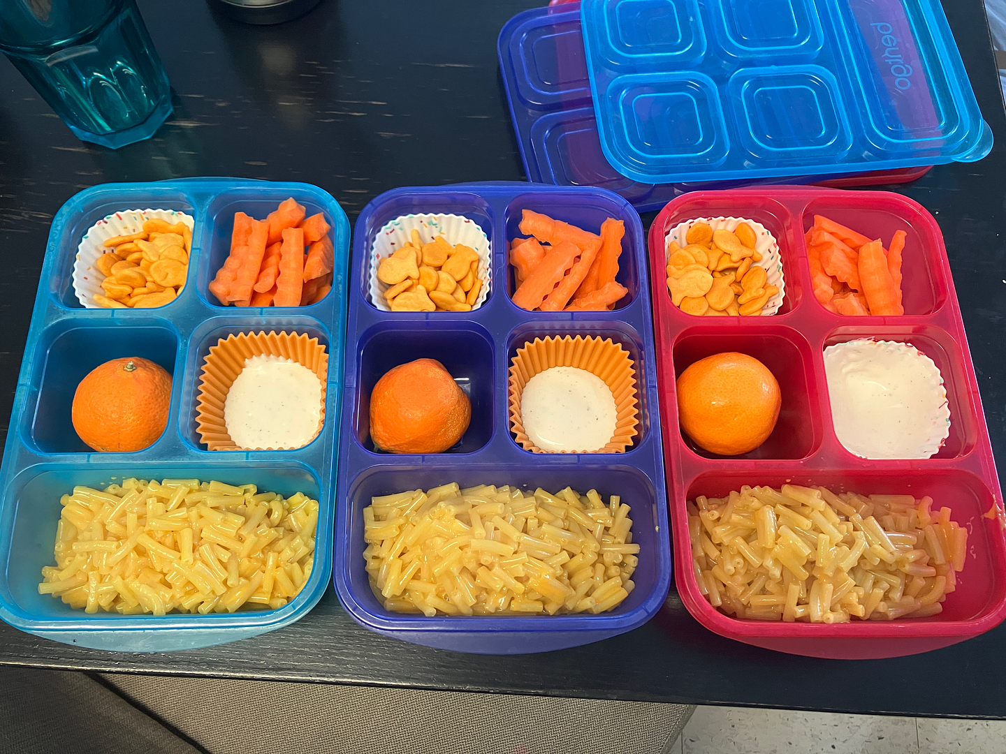 Monday: Orange! KD (Americans, that’s Kraft Mac n’ Cheese), Mandarin oranges, goldfish, carrots