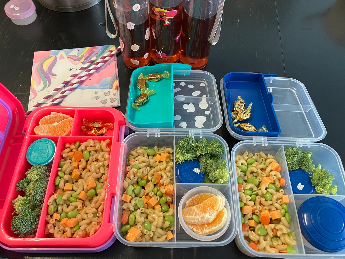 Friday: Unicorn! Unicorn pasta salad (this needs some work), broccoli, oranges, and Werthers originals.