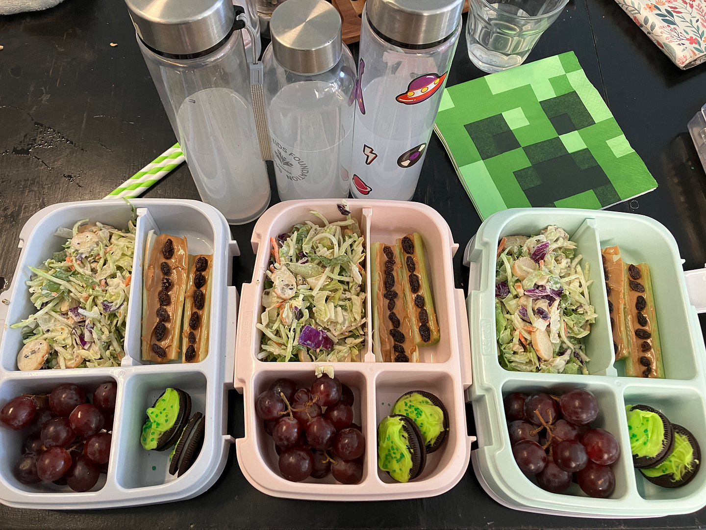 Thursday: Minecraft! Salad, ants on a log, grapes, and “grass block oreos.”