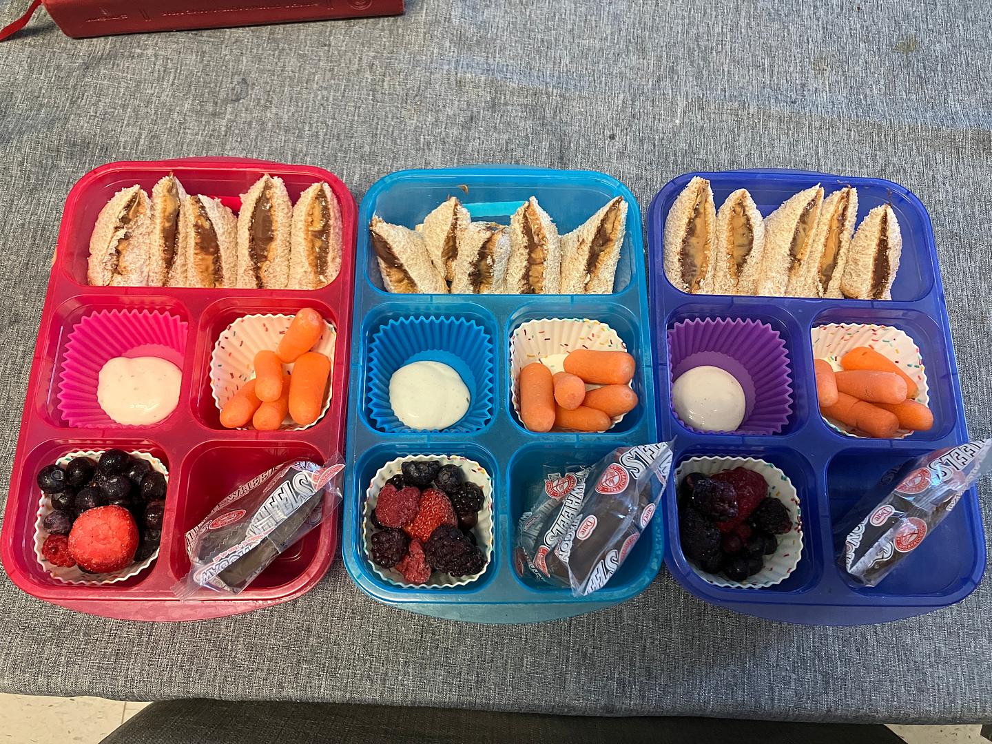 Tuesday: PB & Nutella sandwiches, baby carrots, mixed berries, and Wagon Wheels.