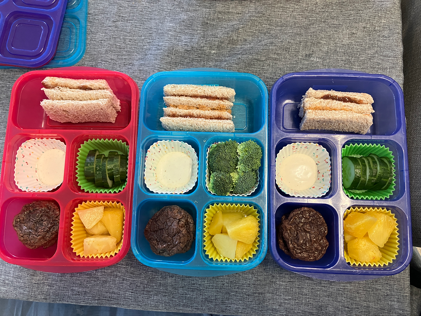 Monday: Double decker PB&J, broccoli/cucumber, pineapple, chocolate crackle cookies.
