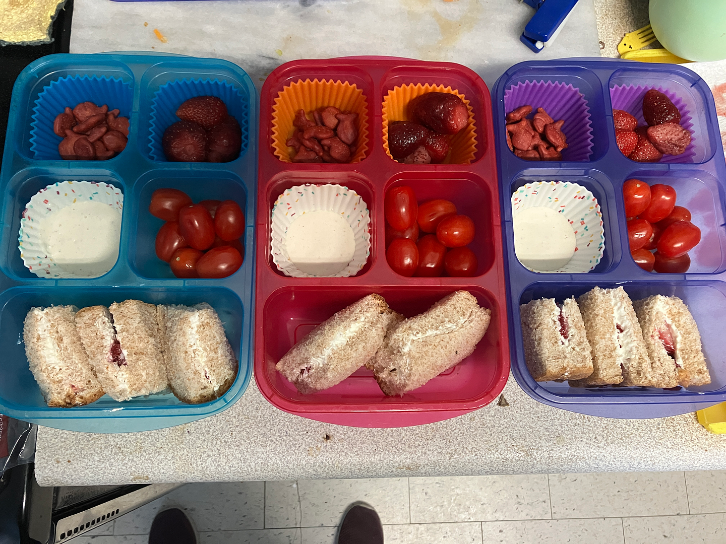 Thursday: Red! Strawberry and cream cheese sandwiches (true confessions: these were not a hit and were swapped for Nutella sandwiches almost immediately), cherry tomatoes, strawberries, and red goldfish. (We just got one of those bags of colourful goldfish and separated them. Yep.)