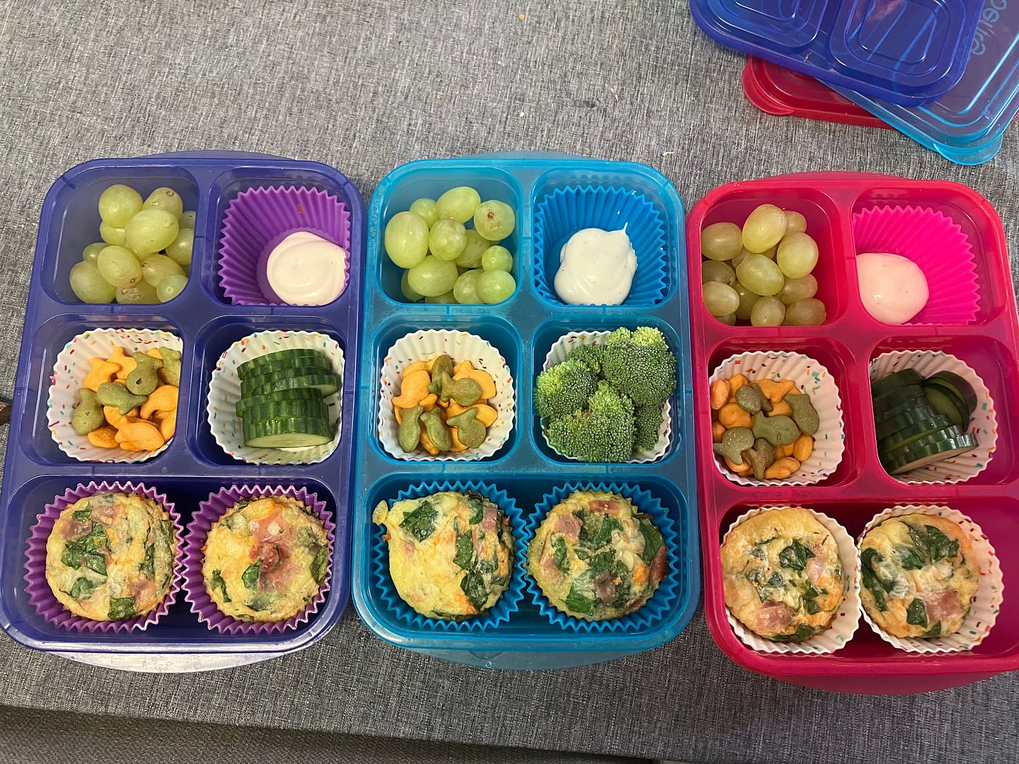 Wednesday: Green! Spinach mini-frittatas (made in bulk and frozen), green grapes, cucumber/broccoli, green goldfish.