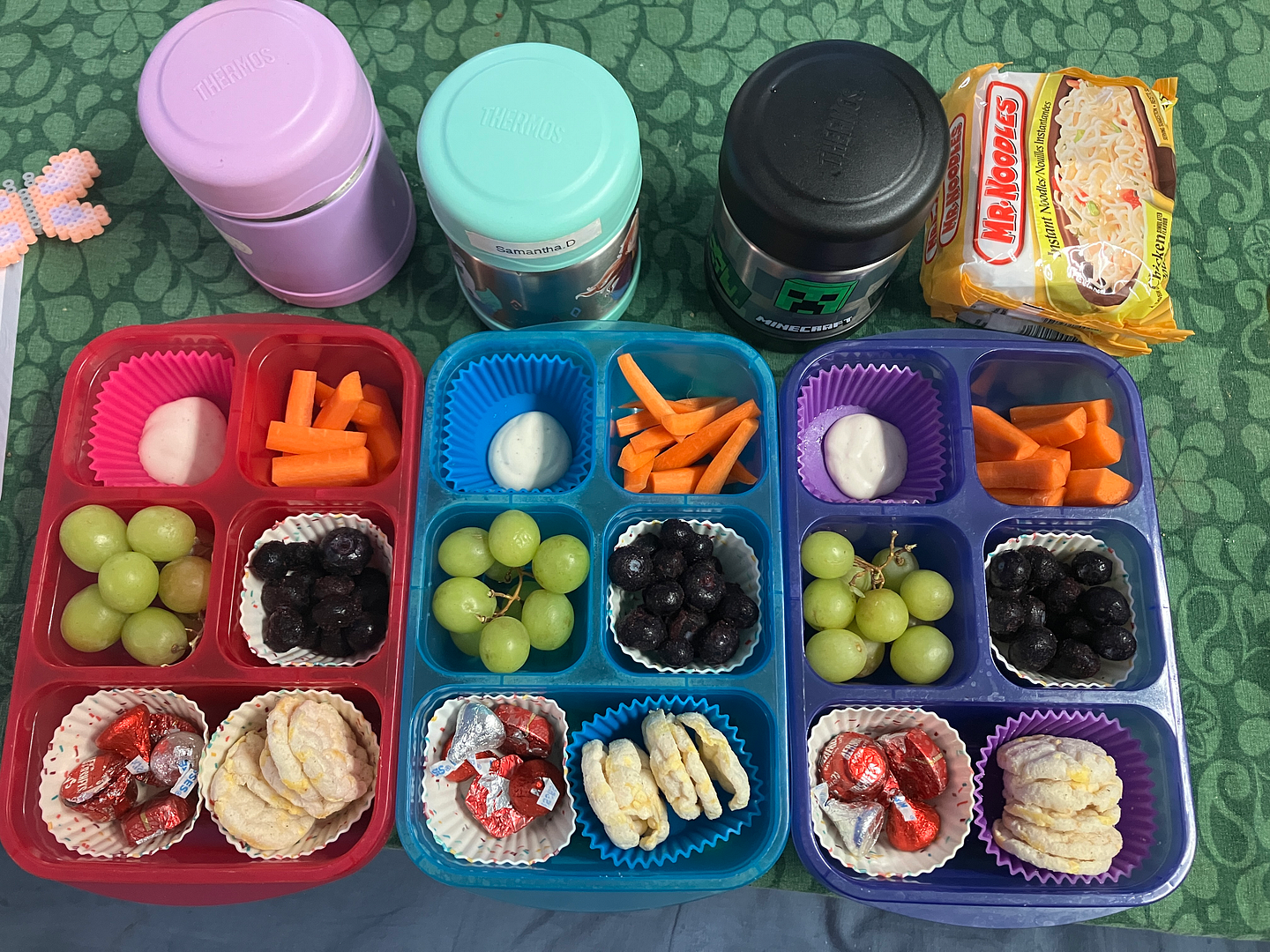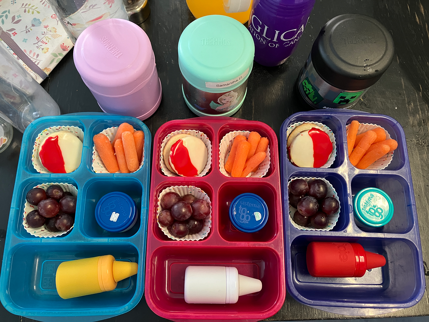 Monday: Pokemon! KD for Pikachu (in the thermoses; that’s ketchup in those lil’ bottles), red grapes (for Bulbasaur maybe?), carrots (for charmander?). That’s ranch in the little containers – easier to not have to wash out every day; these kids love their ranch dressing.